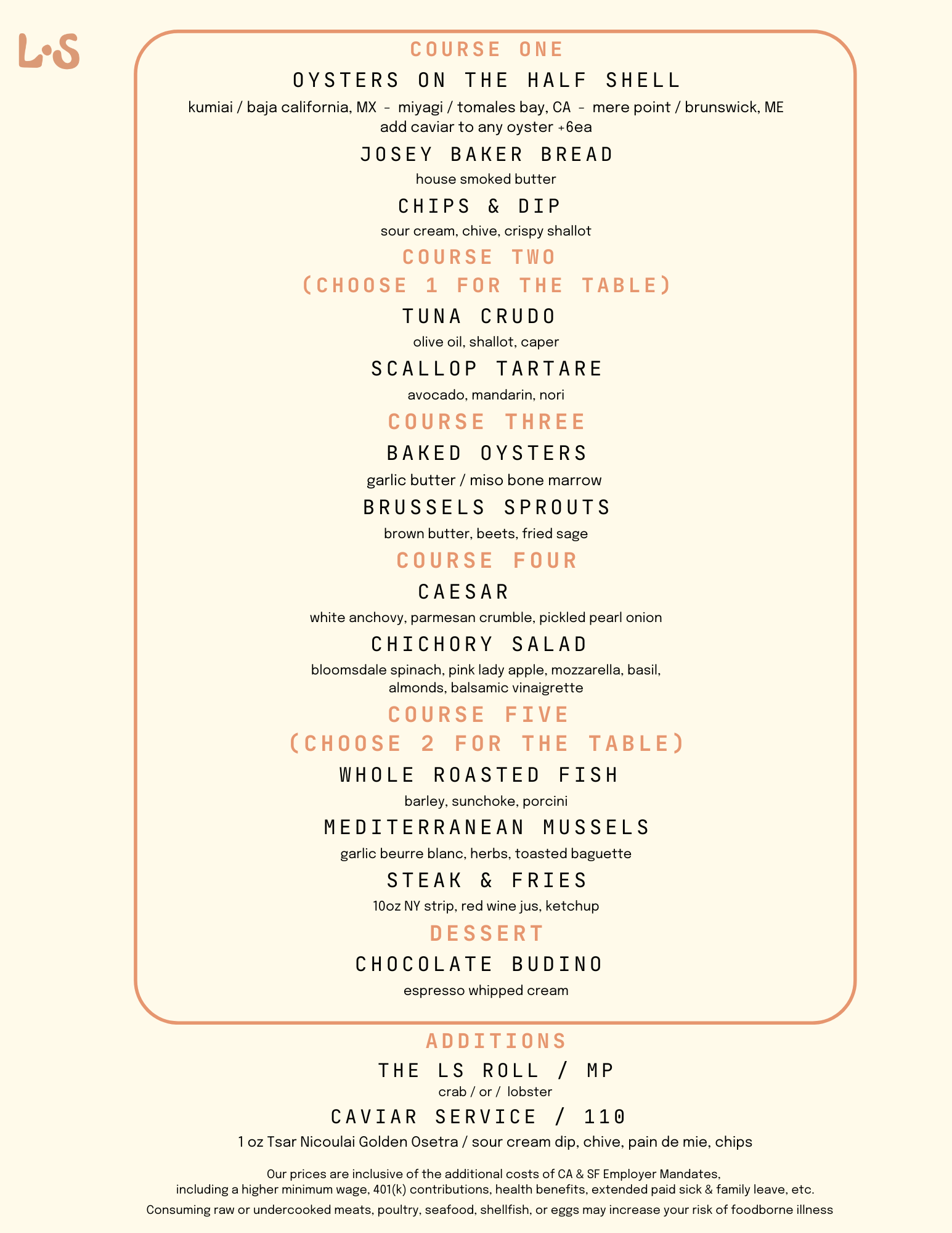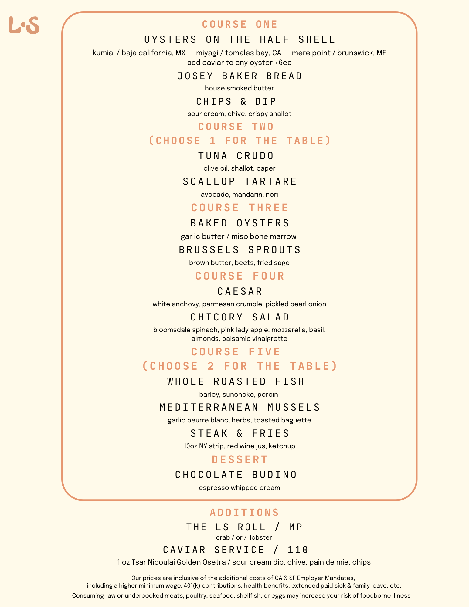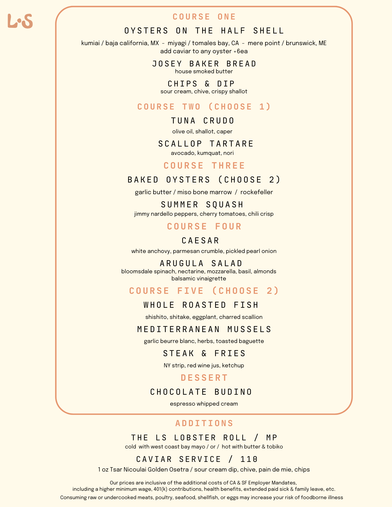 Raw bar items, baked oysters and more make for an unforgettable large group experience. Available for 9-10 guests at $75/person + beverages, tax and service.
